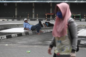 Penumpang berada di lorong terminal Giwangan, DI Yogyakarta, Selasa (28/4/2020). Aktivitas penumpang bus di Terminal Giwangan Yogyakarta pada awal bulan Ramadhan terpantau sepi, setelah berlakunya kebijakan larangan mudik dari pemerintah. ANTARA FOTO/Hendra Nurdiyansyah/pras.