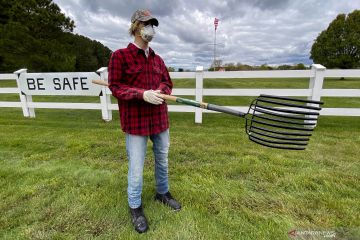 Sebuah manekin berpakaian seperti petani mengenakan masker dan patung yang meyerupai partikel virus Corona (COVID-19) terlihat di luar properti yang berbatasan dengah jalan menuju St. Michaels, Maryland, disaat mewabahnya penyakit COVID-19, di AS, Senin (27/4/2020). ANTARA FOTO/Reuters-Katherine Jackson/hp.
