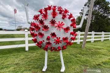 Sebuah patung yang menyerupai partikel virus Corona (COVID-19) terlihat di luar properti yang berbatasan dengah jalan menuju St. Michaels, Maryland, disaat mewabahnya penyakit COVID-19, di AS, Senin (27/4/2020). ANTARA FOTO/Reuters-Katherine Jackson/hp.