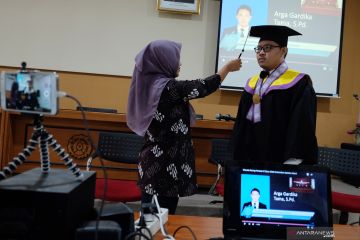 Wisudawan Universitas Sebelas Maret (UNS), Arga Gardika Tama (kanan) didampingi kerabatnya mengikuti prosesi acara Wisuda Daring Periode II 2020 UNS di Solo, Jawa Tengah, Sabtu (2/5/2020). Sebanyak 259 wisudawan mengikuti acara wisuda daring tersebut karena kebijakan physical distancing akibat dari wabah COVID-19. ANTARAFOTO/Maulana Surya/hp.