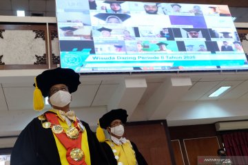 Rektor Universitas Sebelas Maret (UNS), Jamal Wiwoho (ketiga kiri) menyampaikan pidato pada acara Wisuda Daring Periode II 2020 UNS di auditorium universitas setempat, Solo, Jawa Tengah, Sabtu (2/5/2020). Sebanyak 259 wisudawan mengikuti acara wisuda daring tersebut karena kebijakan physical distancing akibat dari wabah COVID-19. ANTARAFOTO/Maulana Surya/hp.