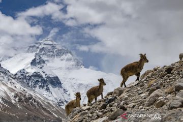Kawanan domba biru terlihat di Cagar Alam Nasional Gunung Qomolangma di Daerah Otonom Tibet, China barat daya, 29 April 2020. ANTARA FOTO/Xinhua/Purbu Zhaxi/pras.