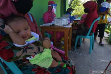 Petugas memberikan vaksin kepada salah satu anak saat imunisasi di salah satu posyandu di Palu, Sulawesi Tengah, Rabu (6/5/2020). Meski tengah dilanda pandemi COVID-19, pelaksanaan imunisasi yang bertujuan untuk menjaga kesehatan anak tersebut tetap berjalan, dengan menerapkan jaga jarak (physical distancing), dilaksanakan pada ruang terbuka serta wajib menggunakan masker. ANTARA FOTO/Mohamad Hamzah/hp.