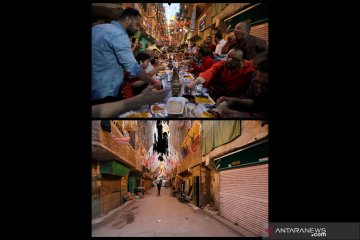 Foto kombinasi yang menampilkan warga kampung Ezbet Hamada di Distrik Mataria berkumpul saat menyantap makanan berbuka puasa di bulan suci Ramadhan di Kairo, Mesir, Senin 20 Mei 2019 (atas) dan seorang pria berjalan di lorong yang kosong di lokasi yang sama menjelang waktu berbuka puasa di tengah merebaknya wabah COVID-19 di Kairo, Mesir, Jumat (1/5/2020). ANTARA FOTO/REUTERS/Mohamed Abd El Ghany/wsj.