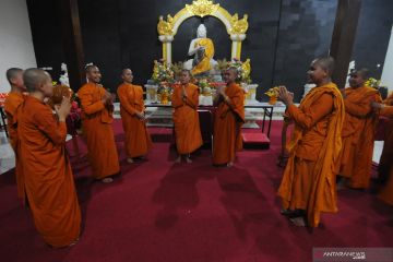 Sejumlah Samaneri dan Samanera saling berbincang mengucapkan selamat Waisak 2564 BE seusai prosesi doa dan meditasi di Vihara Abhayagiri Samudra Bakti, Boyolali, Jawa Tengah, Kamis (7/5/2020). Perayaan Waisak 2564 BE tahun 2020 ini mengangkat tema "Mawas Diri dan Toleransi Jaga Keharmonisan Bangsa" serta mendoakan agar pandemi COVID-19 segera cepat berlalu. ANTARA FOTO/Aloysius Jarot Nugroho/hp.