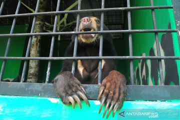 Seekor Beruang Madu (Helarctos Malayanus) betina bernama Berry (3 tahun) berada di kandang perawatan, Tempat Penitipan Satwa BKSDA Jambi, Jambi, Senin (18/5/2020). Berry merupakan satwa sitaan BKSDA Jambi atas kasus pelanggaran hukum pada 2018 silam di Kabupaten Tebo yang saat ini masih mendapatkan perawatan dan sekaligus upaya peliaran guna meningkatkan kemampuan bertahan hidupnya saat nantinya dilepasliarkan. ANTARA FOTO/Wahdi Septiawan/aww.