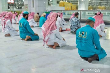 Umat Islam menunaikan shalat berjamaah dengan mempraktikan jaga jarak fiisk di 10 malam terakhir untuk mendapatkan malam Lailatul Qadar bulan Ramadhan masih di tengah mewabahnya COVID-19 di Masjidil Haram, Kota Suci Mekah, Arab Saudi, Selasa (19/5/2020). ANTARA FOTO/Saudi Press Agency/Handout via REUTERS/wsj.