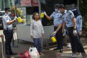 Petugas menyemprot keluarga yang hendak bersilaturahmi dengan warga binaan Lembaga Pemasyarakatan Kelas I Cipinang dengan cairan disinfektan di Jakarta, Senin (25/5/2020). Kementerian Hukum dan HAM meniadakan kunjungan secara fisik terhadap warga binaan Lapas maupun Rutan saat Hari Raya Idul Fitri 1441 Hijriah untuk mengantisipasi penyebaran COVID-19 dan menggantikannya dengan menyediakan fasilitas komunikasi berbasis panggilan video. ANTARA FOTO/Aditya Pradana Putra/pras.