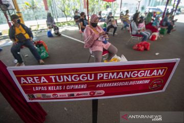 Sejumlah warga menunggu giliran bisa bersilaturahmi dengan warga binaan Lembaga Pemasyarakatan Kelas I Cipinang di Jakarta, Senin (25/5/2020). Kementerian Hukum dan HAM meniadakan kunjungan secara fisik terhadap warga binaan Lapas maupun Rutan saat Hari Raya Idul Fitri 1441 Hijriah untuk mengantisipasi penyebaran COVID-19 dan menggantikannya dengan menyediakan fasilitas komunikasi berbasis panggilan video. ANTARA FOTO/Aditya Pradana Putra/pras.