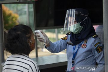 Petugas sipir mengukur suhu badan keluarga yang hendak bersilaturahmi dengan warga binaan Lembaga Pemasyarakatan Kelas I Cipinang di Jakarta, Senin (25/5/2020). Kementerian Hukum dan HAM meniadakan kunjungan secara fisik terhadap warga binaan Lapas maupun Rutan saat Hari Raya Idul Fitri 1441 Hijriah untuk mengantisipasi penyebaran COVID-19 dan menggantikannya dengan menyediakan fasilitas komunikasi berbasis panggilan video. ANTARA FOTO/Aditya Pradana Putra/pras.