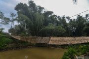 Warga meniti jembatan rusak di Desa Banjarsari, Kabupaten Tasikmalaya, Rabu (27/5/2020). Meskipun jembatan gantung yang menghubungkan tiga desa, Banjarsari, Sukaratu dan Tanjungsari tali slingnya putus akibat diterjang luapan Sungai Cikidang sebulan lalu, warga masih nekat melewati jembatan tersebut untuk aktivitas sehari-hari karena alasan kecepatan dan jarak tempuh. ANTARA FOTO/Adeng Bustomi/wsj.