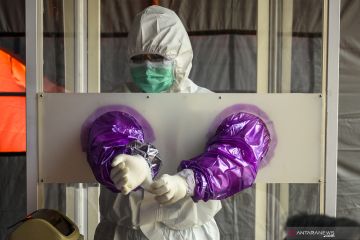 Seorang petugas medis mepersiapkan pakaian pelindung diri sebelum menagmbil sampel dahak pada Rapid dan Swab Test massal bagi Aparatur Sipil Negara (ASN) di Posko Gugus Tugas COVID-19 Sulawesi Tengah di Palu, Rabu (3/6/2020). Tes massal itu untuk mendeteksi dini COVID-19 bagi ASN, terutama yang akan melakukan perjalanan dan ibu hamil untuk mencegah penyebaran virus corona. ANTARAFOTO/Basri Marzuki/hp.