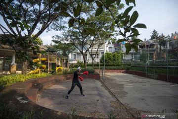 Petinju Michael Muskita berlatih mandiri di taman dekat tempat tinggalnya di Sumur Batu, Babakan Madang, Kabupaten Bogor, Jawa Barat, Jumat (5/6/2020). Petinju kelas 75 kilogram asal Ambon tersebut harus berlatih secara mandiri saat masa pandemi COVID-19 untuk mempersiapkan diri mengikuti Kejuaraan Dunia Tinju di Prancis sekaligus sebagai ajang kualifikasi Olimpiade Tokyo. ANTARA FOTO/Aditya Pradana Putra/foc.