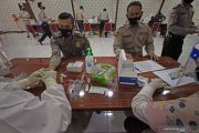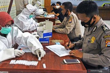 Sejumlah anggota polisi mengikuti tes diagnostik cepat (rapid test) COVID-19 di Mapolres Kota Serang, Banten, Rabu (10/6/2020). Rapid test yang diikuti 726 personel tersebut merupakan upaya untuk mendeteksi kondisi kesehatan anggota polisi setempat sekaligus untuk mencegah penularan COVID-19 diantara sesama anggota maupun saat berinteraksi dengan masyarakat. ANTARA FOTO/Asep Fathulrahman/hp.