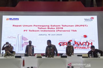 Direktur Utama PT Telkom Indonesia (Persero) Tbk Ririek Adriansyah (ketiga kanan) bersama Direktur Network & IT Solution Herlan Wijanarko (kiri), Direktur Keuangan Heri Surpriadi (kedua kiri), Direktur Strategic Portfolio Budi Setyawan Wijaya (ketiga kiri), Direktur Digital Business Muhammad Fajrin Rasyid (kedua kanan) dan Direktur Wholesale & International Service Dian Rachmawan (kanan) menghadiri Rapat Umum Pemegang Saham Tahunan (RUPST) di Jakarta, Jumat (19/6/2020). RUPST Telkom Indonesia menyetujui pembagian dividen sebesar Rp15,26 triliun serta menyetujui payout ratio sebesar 81,78 persen dengan rincian 60 persen atau sebesar Rp11,20 triliun merupakan dividen tunai dan 21,78 persen atau Rp4,06 triliun merupakan dividen spesial. Selain itu, rapat tersebut menyetujui perubahan susunan pengurus Dewan Komisaris dan Dewan Direksi Perseroan. ANTARA FOTO/Galih Pradipta/aww.
