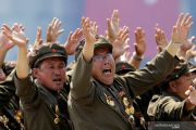 FOTO ARSIP: Sejumlah veteran Perang Korea melambaikan tangan sambil meneriakkan slogan kepada Pemimpin Korea Utara Kim Jong-un saat peringatan ke-60 tahun gencatan senjata Perang Korea 1950-1953 di Lapangan Kim Il-sung, Pyongyang, Korea Utara (27/7/2013). ANTARA FOTO/REUTERS/Jason Lee/Foto Arsip/wsj.
