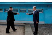 FOTO ARSIP: Presiden Korea Selatan Moon Jae-in (kanan) berjabat tangan dengan Pemimpin Korea Utara Kim Jong-un di lokasi gencatan senjata Desa Panmunjom di kawasan Zona Demiliterisasi yang memisahkan kedua Korea di Korea Selatan (27/4/2018). ANTARA FOTO/Korea Summit Press Pool/via REUTERS/Foto Arsip/wsj.