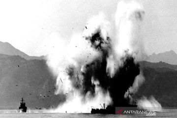 FOTO ARSIP: Kapal penyapu ranjau Republik Korea YMS-516 meledak oleh sebuah ranjau magnetik saat operasi sapu ranjau di barat Kalma Pando, Pelabuhan Wonsan (18/10/1950). ANTARA FOTO/Official US Navy Photograph via National Archives/Handout via REUTERS/Foto Arsip/wsj.