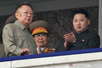 FOTO ARSIP: Pemimpin Korea Utara Kim Jong-il (kiri) berjalan di depan putra bungsunya Kim Jong-un (kanan) saat melihat sebuah parade peringatan ke-65 tahun berdirinya Partai Buruh Korea di Pyongyang, Korea Utara (10/20/2010). ANTARA FOTO/Kyodo/via REUTERS/Foto Arsip/wsj.