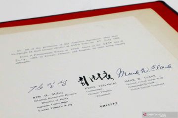 FOTO ARSIP: Tanda tangan dari Pemimpin dan Panglima Tertinggi Tentara Korea Utara Kim Il-sung, kakek dari Pemimpin Korea Utara Kim Jong-un saat ini, terlihat bersama tanda tangan dari pihak China dan PBB di atas Dokumen Perjanjian Gencatan Senjata yang mengakhiri Perang Korea berbahasa Inggris asli yang ditandatangani pada tanggal 27 Juli 1953, saat dipamerkan di Laboratorium Konservasi US National Archives di Adelphi, Maryland dekat Washington, Amerika Serikat (4/6/20198). ANTARA FOTO/REUTERS/Jim Bourg/Foto Arsip/wsj.