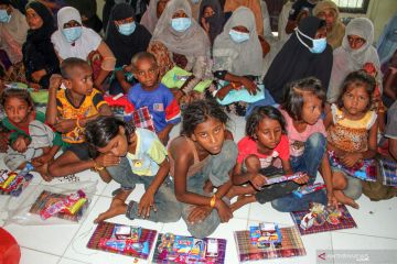 Sejumlah pengungsi etnis Rohingya menunggu di ruangan setelah menjalani pemeriksaan kesehatan dan identifikasi di tempat penampungan sementara di bekas kantor Imigrasi Punteuet, Blang Mangat, Lhokseumawe, Aceh, Jumat (26/6/2020). Hasil identifikasi dan pemeriksaan tes diagnosa cepat (rapid test) COVID-19 menyatakan sebanyak 99 orang pengungsi Rohingya yang sebelumnya terdampar di laut, dinyatakan non reaktif. ANTARA FOTO/Rahmad/foc.