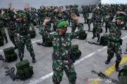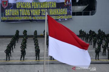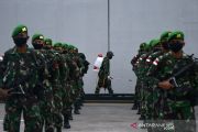 Prajurit TNI AD mengikuti apel penyambutan kepulangan Satgas pengamanan perbatasan RI-Papua Nugini di Pelabuhan Sukarno Hatta, Makassar, Sulawesi Selatan, Minggu (5/7/2020). Sebanyak 474 prajurit dari Kesatuan Batalyon Infanteri 721/Makkasau Kodam XIV Hasanuddin telah dipulangkan usai bertugas mengamankan wilayah perbatasan RI-Papua Nugini selama sepuluh bulan. ANTARA FOTO/Abriawan Abhe/aww.