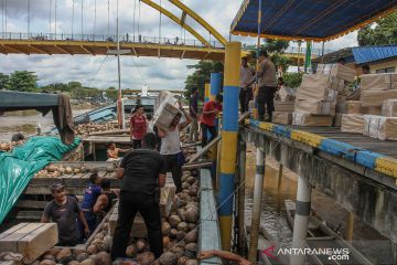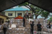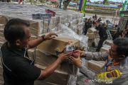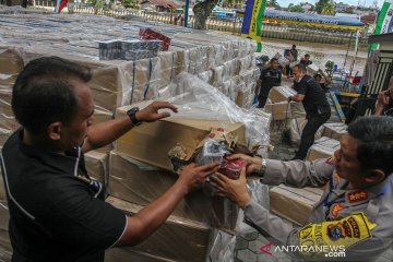 Petugas Kepolisian Polairud Polda Riau mengeluarkan kardus berisi rokok ilegal di Mako Polairud Polda Riau, di Pekanbaru, Riau, Selasa (7/6/2020). Polisi berhasil mengamankan dua orang tersangka dan menyita sebanyak 1.062 kardus berisi sebanyak 531.000 bungkus rokok ilegal dari sebuah kapal pembawa kelapa di perairan Kuala Selat Kabupaten Indragiri Hilir dengan nilai kerugian negara diperkirakan mencapai Rp4.991.400.000. ANTARA FOTO/Rony Muharrman/pras.