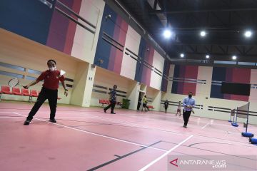 Menteri Pemuda dan Olahraga Zainudin Amali bermain bulu tangkis usai meninjau calon kantor panitia penyelenggara Piala Dunia U-20 2021 (INAFOC) di GBK Arena, Senayan, Jakarta, Jumat (10/7/2020). INAFOC akan berkantor di GBK Arena selama persiapan hingga penyelenggaraan Piala Dunia U-20 2021 pada 20 Mei sampai 11 Juni 2021. ANTARA FOTO/Puspa Perwitasari/aww.