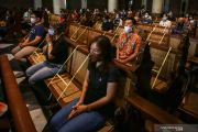 Umat Katolik mengikuti misa mingguan di Gereja Katedral, Jakarta, Minggu (12/7/2020). Dalam masa PSBB transisi, Gereja Katedral Jakarta kembali menggelar misa bagi jemaat dengan menerapkan protokol kesehatan untuk mencegah penularan COVID-19. ANTARA FOTO/Rivan Awal Lingga/foc.