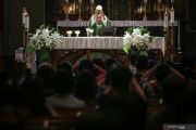 Pastor memimpin misa mingguan di Gereja Katedral, Jakarta, Minggu (12/7/2020). Dalam masa PSBB transisi, Gereja Katedral Jakarta kembali menggelar misa bagi jemaat dengan menerapkan protokol kesehatan untuk mencegah penularan COVID-19. ANTARA FOTO/Rivan Awal Lingga/foc.