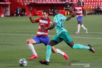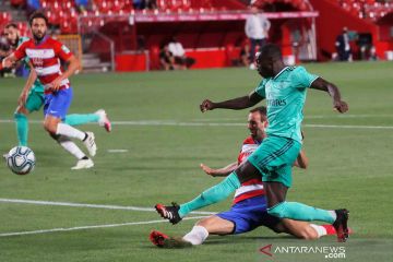 Pemain Real Madrid Ferland Mendy (kanan) mencetak gol ke gawang Granada pada pertandingan lanjutan Liga Spanyol tanpa penonton di tengah wabah COVID-19 di Nuevo Estadio de Los Carmenes, Granada, Spanyol, Senin (13/7/2020). Real Madrid dekati gelar juara La Liga usai mengalahkan tuan rumah Granada dengan skor akhir 1-2. ANTARA FOTO/REUTERS/Jon Nazca/wsj.