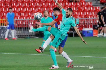 Pemain Real Madrid Karim Benzema (kanan) berebut bola dengan pemain Granada Antonio Puertas pada pertandingan lanjutan Liga Spanyol tanpa penonton di tengah wabah COVID-19 di Nuevo Estadio de Los Carmenes, Granada, Spanyol, Senin (13/7/2020). Real Madrid dekati gelar juara La Liga usai mengalahkan tuan rumah Granada dengan skor akhir 1-2. ANTARA FOTO/REUTERS/Jon Nazca/wsj.