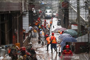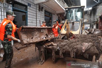 Sejumlah petugas dan penduduk setempat membersihkan lumpur di jalan di Subdistrik Wuqiao yang dilanda banjir di Distrik Wanzhou, Kota Chongqing, China barat daya, Sabtu (18/7/2020). Setelah banjir melanda banyak jalan di sepanjang Sungai Wuqiao pada Kamis (16/7), tim penyelamat membantu penduduk setempat membersihkan sisa-sisa banjir. ANTARA FOTO/Xinhua/Huang Wei/pras.
