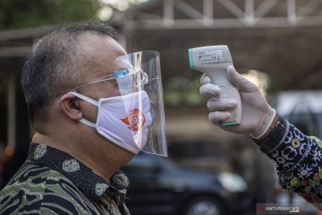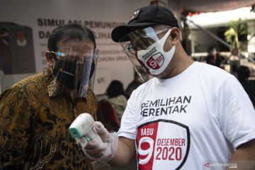 Petugas KPPS memeriksa suhu tubuh pemilih yang akan menggunakan hak suaranya saat simulasi pemungutan suara pemilihan serentak 2020 di Jakarta, Rabu (22/7/2020). Simulasi tersebut digelar untuk memberikan edukasi kepada masyarakat terkait proses pemungutan dan penghitungan suara Pilkada serentak 2020 yang akan dilaksanakan pada 9 Desember 2020 dengan menerapkan protokol kesehatan COVID-19. ANTARA FOTO/Nova Wahyudi/hp.