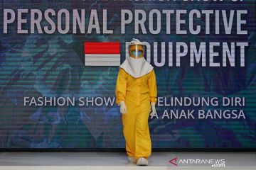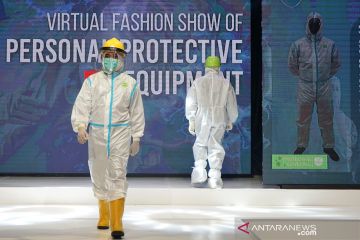 Petugas medis memperagakan busana Alat Pelindung Diri (APD) COVID-19 saat Peragaan Busana Virtual APD COVID-19 di kantor GM Production, Sleman, D.I Yogyakarta, Sabtu (1/8/2020). Peragaan yang menampilkan APD COVID-19 produksi UMKM di Yogyakarta secara virtual itu menjadi media apresiasi bagi petugas medis, relawan serta UMKM yang turut berjuang melawan pandemi COVID-19. ANTARA FOTO/Andreas Fitri Atmoko/wsj.