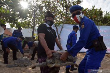 Petugas dan pemerhati satwa dilindungi mengawasi sejumlah penyu hijau (Chelonia mydas) saat pelepasliaran di Pantai Kuta, Badung, Bali, Rabu (5/8/2020). Ditpolairud Polda Bali, Balai Konservasi Sumber Daya Alam (BKSDA) Bali dan para pemerhati satwa dilindungi melepasliarkan 25 dari 36 ekor penyu hijau hasil sitaan dari upaya penyelundupan di perairan Serangan, Denpasar dan 11 ekor lainnya sebagai barang bukti dalam persidangan dengan delapan tersangka. ANTARA FOTO/Nyoman Hendra Wibowo/nym/hp.