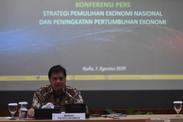 Menko Perekonomian Airlangga Hartarto menyampaikan keterangan pers tentang perekonomian nasional di masa pandemi COVID-19 di Jakarta, Rabu (5/8/2020). Airlangga mengatakan setelah pada kuartal II tahun 2020 ekonomi Indonesia terkoreksi 5,32 persen, dibutuhkan belanja minimal Rp800 triliun per kuartal ke berbagai sektor untuk mempersempit ruang pertumbuhan negatif. ANTARA FOTO/Akbar Nugroho Gumay/wsj.