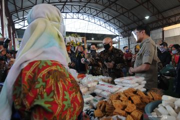 Menteri Koperasi dan UMKM Teten Masduki (kedua kanan) didampingi Wali Kota Salatiga Yuliyanto (kanan) melihat dagangan buah pisang di Pasar Blauran, Salatiga, Jawa Tengah, Kamis (6/8/2020). Selain melihat kondisi aktivitas ekonomi di pasar tersebut, Teten Masduki juga memberikan arahan kepada pemerintah daerah untuk tetap mendukung dalam segi pemasaran hasil produk pelaku usaha mikro, kecil dan menengah agar tetap berkembang saat pandemi COVID-19. ANTARA FOTO/Aloysius Jarot Nugroho/hp.