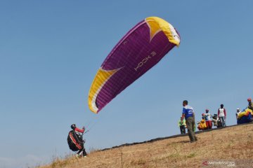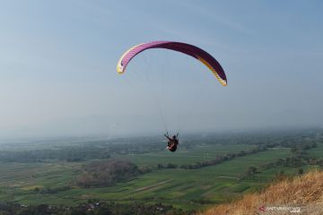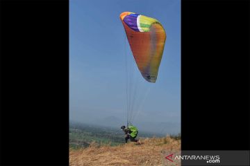 Atlet paralayang berlatih di kawasan Gunung Gede Tatung, Kabupaten Ponorogo, Jawa Timur, Sabtu (8/8/2020). Sebanyak 20 atlet paralayang dari Ponorogo, Madiun, Pacitan dan Blitar, Jawa Timur mulai berlatih kembali setelah sekitar empat bulan tidak melakukan kegiatan akibat pandemi COVID-19. ANTARA FOTO/Siswowidodo/wsj.