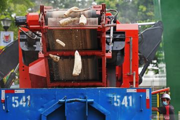 Pekerja dari Dewan Taman Nasional (National Parks Board/NParks) Singapura memindahkan gading gajah sitaan untuk dimusnahkan dalam rangka memperingati Hari Gajah Sedunia yang jatuh pada 12 Agustus di salah satu fasilitas NParks, di Singapura, Selasa (11/8/2020). NParks menghancurkan 9 ton gading gajah senilai 18 juta dolar Singapura (1 dolar Singapura = Rp10.694), yang sebagian besar disita pada 21 Juli 2019 dalam penyitaan gading gajah terbesar di negara tersebut. ANTARA FOTO/Xinhua-Then Chih Wey/hp.