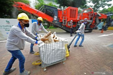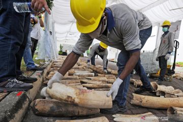 Para pekerja dari Dewan Taman Nasional (National Parks Board/NParks) Singapura memindahkan gading gajah sitaan untuk dimusnahkan dalam rangka memperingati Hari Gajah Sedunia yang jatuh pada 12 Agustus di salah satu fasilitas NParks, di Singapura, Selasa (11/8/2020). NParks menghancurkan 9 ton gading gajah senilai 18 juta dolar Singapura (1 dolar Singapura = Rp10.694), yang sebagian besar disita pada 21 Juli 2019 dalam penyitaan gading gajah terbesar di negara tersebut. ANTARA FOTO/Xinhua-Then Chih Wey/hp.