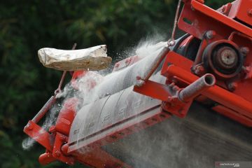 Potongan dan serpihan gading gajah berjatuhan dari conveyor belt mesin penghancur pada tahap kedua penghancuran, dalam rangka memperingati Hari Gajah Sedunia yang jatuh pada 12 Agustus, di salah satu fasilitas Dewan Taman Nasional (National Parks Board/NParks) Singapura, di Singapura, Selasa (11/8/2020). NParks menghancurkan 9 ton gading gajah senilai 18 juta dolar Singapura (1 dolar Singapura = Rp10.694), yang sebagian besar disita pada 21 Juli 2019 dalam penyitaan gading gajah terbesar di negara tersebut. ANTARA FOTO/Xinhua-Then Chih Wey/hp.