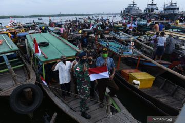 Seorang prajurit TNI AL memberikan bendera merah putih kepada nelayan di Mako Lantamal I Belawan Medan, Sumatera Utara, Kamis (13/8/2020). Pemberian 1.000 bendera merah putih kepada para nelayan tersebut dalam rangka menyemarakkan peringatan HUT Kemerdekaan ke-75 RI dan menanamkan nilai-nilai kebangsaan serta semangat nasionalisme. ANTARA FOTO/Septianda Perdana/hp.