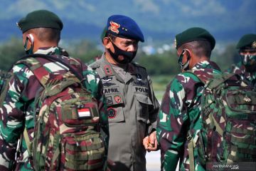 Kapolda Sulawesi Tengah Irjen Pol Syafril Nursal (tengah) memberi semangat kepada sejumlah personil TNI setibanya di Bandara Mutiara Sis Aljufri Palu di Palu, Sulawesi Tengah, Sabtu (15/8/2020). Sebanyak 150 anggota Tentara Nasional Indonesia (TNI) dari Mabes TNI Angkatan Darat akan bergabung bersama pihak kepolisian dalam Tim Satuan tugas Tinombala, guna mengejar sisa-sisa Kelompok teroris Mujahidin Indonesia Timur (MIT) yang ada di Kabupaten Poso, Sulawesi Tengah. ANTARA FOTO/Mohamad Hamzah/pras.
