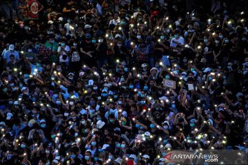Pengunjuk rasa pro-demokrasi menggunakan ponsel sebagai senter ketika mereka menghadiri aksi untuk menuntut pemerintah mundur, membubarkan parlemen dan mengadakan pemilihan baru di bawah konstitusi yang direvisi, di dekat Monumen Demokrasi di Bangkok, Thailand, Minggu 16 Agustus 2020. ANTARA FOTO/REUTERS / Soe Zeya Tun/aww.