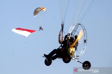Pilot paramotor mengibarkan bendera Merah Putih di ketinggian dalam pemecahan rekor Museum Rekor Indonesia (MURI) di Lanud Atang Sendjaja (ATS), Kabupaten Bogor, Jawa Barat, Senin (17/8/2020). Cabang olahraga dirgantara Paramotor FASI berhasil memecahkan rekor pengibaran bendera merah putih pada ketinggian terbang 2.020 m (6.627 kaki) di atas permukaan tanah dalam rangka perayaan HUT ke-75 Kemerdekaan Republik Indonesia. ANTARA FOTO/Yulius Satria Wijaya/pras.