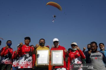 Sekjen Federasi Aero Sport Indonesia (FASI) Marsma TNI Basuki Rochmat (ketiga kiri) dan Asisten Deputi Pengelolaan Olahraga Rekreasi Kemenpora Maifrizon (ketiga kanan) menunjukan piagam rekor Museum Rekor Indonesia (MURI) setelah pemecahanan rekor pengibaran bendera merah putih tertinggi di Lanud Atang Sendjaja (ATS), Kabupaten Bogor, Jawa Barat, Senin (17/8/2020).Cabang olahraga dirgantara Paramotor FASI berhasil memecahkan rekor pengibaran bendera merah putih pada ketinggian terbang 2.020 m (6.627 kaki) di atas permukaan tanah dalam rangka perayaan HUT ke-75 Kemerdekaan Republik Indonesia. ANTARA FOTO/Yulius Satria Wijaya/pras.