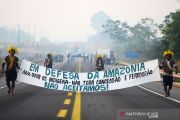 Masyarakat adat Kayapo memblokir jalan raya nasional BR 163 Brasil, karena mereka memprotes tindakan pemerintah di tanah adat untuk menghindari penyebaran penyakit virus Corona (COVID-19), di Novo Progresso, negara bagian Para, Brasil, Senin (17/8/2020). Spanduk dibentangkan berbunyi: "Dalam membela Amazon. Tanpa mendengarkan penduduk asli, tidak akan ada konsesi dan rel kereta api. Kami tidak terima!". ANTARA/REUTERS/Lucas Landau/aa.