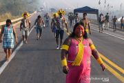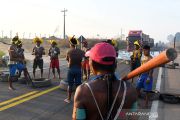 Sejumlah warga masyarakat adat Kayapo memblokir jalan raya nasional BR 163 Brasil, karena mereka memprotes tindakan pemerintah di tanah adat untuk menghindari penyebaran penyakit virus corona (COVID-19), di Novo Progresso, negara bagian Para, Brasil, Senin (17/8/2020). ANTARA/REUTERS/Lucas Landau/aa.