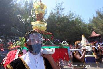 Warga memikul sesaji yang akan dilarung ke laut di Pantai Serang, Blitar, Jawa Timur, Jumat (21/8/2020). Larung sesaji berisi hasil bumi dan laut warga yang dilaksanakan pada bulan suro (Muharam) penanggalan jawa tersebut sebagai wujud syukur masyarakat pesisir pantai selatan pulau Jawa. ANTARA FOTO/Irfan Anshori/aww.